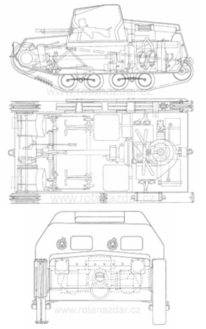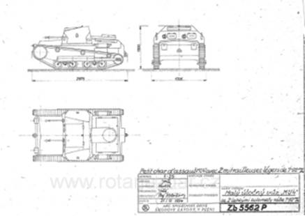 Экипаж 2 чел. Вооружение, состоявшее из двух пехотных пулеметов ZB vz.26 калибра 7,92-мм, находилось в лобовом листе корпуса в шаровых установках. Размещение пулеметов имело сильно ограниченный угол обстрела. Боекомплект 3600 патронов. На танкетке устанавливался бензиновый 4-цилиндровый двигатель Škoda мощностью 40 л.с. и рабочим объёмом 2660 см.3 (Рис.7)