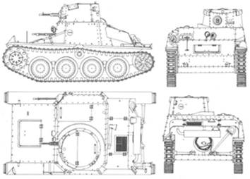 Бронирование: лоб корпуса — 12 мм, лоб корпуса (верх) — 8 мм, борт корпуса — 10 мм, корма корпуса — 8 мм, крыша — 6 мм, корма и диски катков — 5 мм, башня – 10 мм. Горизонтальные бронелисты лобовой части корпуса имели толщину 12 мм, вертикальные – 10 мм. Передний съёмный лист, установленный под углом 70° и предназначавшийся для вентилирования боевого отделения и посадки-высадки водителя, изготавливался из брони толщиной 8 мм. Крыша изготовлялась из 6-мм брони, корма и защита ходовой части – 5 мм. Башня изготовлялась из нескольких гнутых (борта и лоб) и плоских (крыша) бронелистов. Толщина бронирования башни была одинаковой – 10 мм. Экипаж 2 чел. Водитель находился с правой стороны, здесь же помещались органы управления, кроме того, водитель мог вести огонь из пулемета ZB vz.26, который находился в крайнем правом положении от водителя. Углы наведения этого пулемета по горизонтали составляли всего 6° влево и 12° вправо, а по вертикали от -5° до +15°, но обычно этот пулемет фиксировался в положении по центральной оси танка, что упрощало ведение огня из него водителю, впрочем, магазин этого пулемета вмещал всего 20 патронов, боекомплект к пулемету – 200 патронов (10-13 магазинов по 20 патронов в каждом, которые были уложены в отдельный контейнер в носовой части машины). Слева от водителя размещался командир. Командир получил полноценную башню с круговым сектором обстрела (башня была сдвинута влево), в башне стоял пулемет ZB vz.35, имевший также фирменное обозначение ZB-53. (Рис.6, Рис.7)