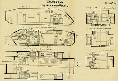 Стреляные гильзы от обоих орудий могли удаляться из боевого отделения через люк в днище корпуса. Боезапас 75-мм выстрелов сократился до 74 снарядов (на В1 боезапас к 75-мм орудию составлял 87 снарядов). (Рис.6)