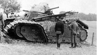 1-я танковая дивизия, приданная для поддержки армейскому корпусу, была брошена для парирования немецкого удара западнее Намюра. 15 мая 1940г. в 8:30 утра возле города Флавиона немецкое ударное соединение 5-й и 7-й танковых дивизий, состоявшее из 219 танков (в основном лёгких Pz.Kpfw.I, Pz.Kpfw.II, Pz. Kpfw.38(t) а также средних Pz.Kpfw. III/IV), столкнулось с двадцатью шестью В1bis 28-го батальона 1-й бронетанковой дивизии французской армии. Большая часть танков, потерянных французами в этом бою, была брошена из-за выхода из строя трансмиссии, расхода горючего и ранения экипажей осколками брони, откалывавшейся внутри танков при попадании в них крупнокалиберных снарядов. (Рис.17)