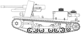 По горизонтали орудие можно было наводить без доворота машины влево и вправо по 15 градусов, угол возвышения - от -18° до +30°. Предполагалось иметь боезапас в 53 унитарных патрона к орудию, которые хранились в металлическом ящике, расположенном в задней части отделения водителя. В ходовой части читается интересное изменение – вместо пластинчатых рессор в качестве элементов подвески установлены пружинные рессоры, а гусеницы были изготовлены из одинарных и коротких звеньев, всего 72 звена из прессованной стали. (Рис.60)