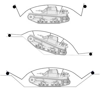 Кривизна каркаса, прикрепленного к корпусу машины, обеспечивала достаточную жесткость и прочность для моста или пандуса через препятствие, чтобы выдерживать вес проезжающих танков типа CV3 или грузовиков. Спереди и сзади конструкции находились складные пандусы на колесиках, которые можно было поднимать или опускать, обеспечивая короткий пролет, необходимый для закрытия зазоров между секцией моста и землей. Пишут, что рампа опускалась экипажем изнутри машины посредством троса. Когда рампа/мост находилась в рабочем положении, через нее проходила техника, экипаж мог выйти из машины. (Рис.70)