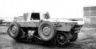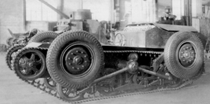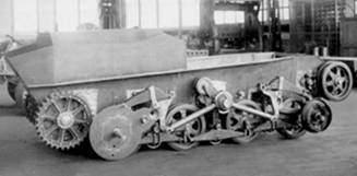 С каждого борта имелось по 4 сдвоенных опорных катка диаметром 610 мм, сблокированных в 2 тележки с рессорной подвеской. Ещё одна, поперечная, рессора использовалась для подвески передней пары колёс. Имелось также два поддерживающих ролика. Ведущее колесо – заднее, переднее – направляющее. Гусеничные ленты теперь состояли из траков скелетного типа. (Рис.6)