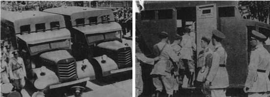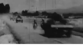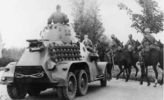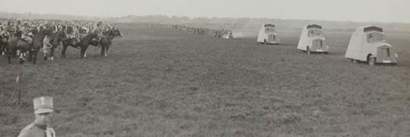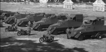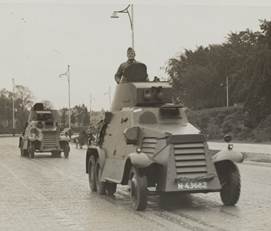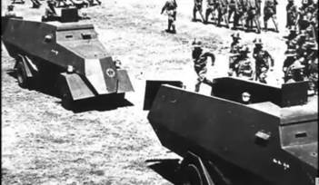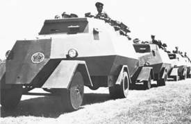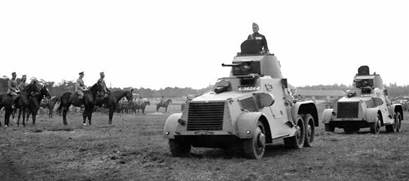 Рис.109а – В кадрах кинохроники, вероятно, машины одного из эскадронов (eskadron paun) на марше. Впереди угадывается силуэт колесного танка АС3D. За ним, на среднем и нижнем фото следуют мотоциклы и БА Braat Overvalwagen.