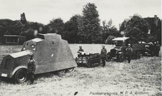 Первой бронеединицей, «ступившей» на землю Королевства Нидерландов был бельгийский броневик, который во время Первой мировой войны в 1914г. случайно заехал на территорию нейтрального государства. Голландцы интернировали машину, а в 1919 году вернули ее хозяевам. В августе 1916 года, армия сумела приобрести три бортовых грузовика Thornycroft из Великобритании, вооруженных13-pounder 9-cwt (76.2 mm) пушками Vickers, обозначенными в голландской службе как 8tl. Все они поступили в моторизованную зенитную батарею.