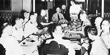 Рис.115d - Первая конференция ABDACOM, вероятно, 3 января 1941г. Сидят за столом (слева направо): адмиралы Лейтон, Хелфрих и Харт, генерал тер Портен, во главе стола полковник Кенген (Королевская армия), Уэйвелл (Брит.) и генералы Бретт и Бреретон (США). Организация была распущена 25 февраля 1942г. в результате серии крупных поражений союзников в этом регионе.