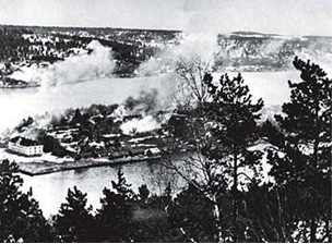 Немцы рассчитывали высадить десант прямо на набережную Осло, полагая, что серьезного сопротивления не будет. После прохождения прожекторного заграждения между Болаерне и Рауёй были направлены штурмовые группы для захвата этих укреплений и главного военного порта Норвегии, Хортена. У северного выхода из прохода Дрёбак находился остров-форт Оскарсборг. В 5:20 неожиданно для немцев две батареи форта открыли перекрёстный огонь из 280-миллиметровых орудий по шедшему первым тяжелому крейсеру «Блюхер» с дистанции 500 метров. На крейсере сразу отказала система управления огнём и начались пожары; маневрируя, он вёл беспорядочный огонь из зенитных орудий. В это время корабль получил две торпедные пробоины от превосходно замаскированной береговой торпедной установки в Кахольме. В 7:23 «Блюхер» затонул на 90-метровой глубине в 400 метрах от берега. (Рис.24)