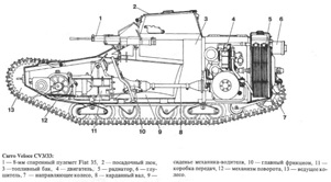 Говорят, макет машины Carro Veloce 3, выполненный из дерева, был представлен уже в 1929 году. Компоновка CV3 была полностью аналогична Carden-Loyd Mk.VI. В передней части находилась трансмиссия, в средней – боевое отделение, в кормовой – моторный отсек. Водитель размещался с правой стороны, командир машины (он же стрелок) – с левой. Вооружение опытного образца состояло из одного 6,5-мм пулемета FIAT (FIAT Model 1914 Water-Cooled 6.5 mm Machine-Gun). Прототип CV3 поступил на испытания в 1930г. (Рис.5, Рис.6)