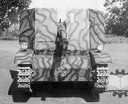 По горизонтали орудие можно было наводить без доворота машины влево и вправо по 15 градусов, угол возвышения - от -18° до +30°. Предполагалось иметь боезапас в 53 унитарных патрона к орудию, которые хранились в металлическом ящике, расположенном в задней части отделения водителя. В ходовой части читается интересное изменение – вместо пластинчатых рессор в качестве элементов подвески установлены пружинные рессоры, а гусеницы были изготовлены из одинарных и коротких звеньев, всего 72 звена из прессованной стали. (Рис.56)