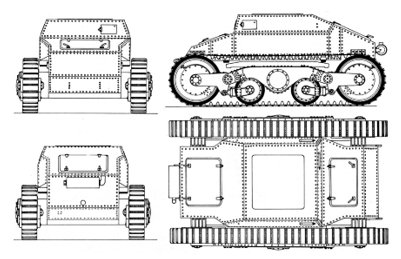 Корпус машины представлял собой бронированную коробку, разделённую на два отсека: боевой (совмещен с отсеком управления) и моторно-трансмиссионный. Верхние лобовые листы устанавливались под значительными углами наклона и имели максимальную толщину брони 23 мм. Борта защищались 13-мм бронелистами, днище и крыша имели толщину 9 мм. При этом геометрические размеры танка были минимальными: длина — 3640 мм, ширина — 2314 мм, высота — 2010 мм, клиренс — 300 мм. В задней части корпуса устанавливался 4-цилиндровый 4-тактный бензиновый двигатель мощностью 100 л.с. Трансмиссия включала два распределительных вала и коробку передач с сухим сцеплением. В ходовой части использовались ведущие и направляющие колёса одинакового диаметра 950 мм оснащенные резиновыми бандажами.