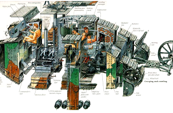 Рис.40 - Внутри ромбовидного танка, вверху вид на водителя (впереди двигателя), в середине –танкист в одном пространстве с двигателем, снизу – места помощников водителя (позади двигателя).