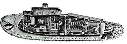 В силовом отделении за сдвижной перегородкой разместили инженера-механика для наблюдения за двигателем и трансмиссией. На британских танках предполагалось устанавливать 300-сильные двигатели от «Роллс-ройса». В обитаемом отделении установили вентиляторы, поддерживавшие давление несколько выше атмосферного - первый случай введения в танке «избыточного давления» для защиты экипажа от газов (Рис.9).