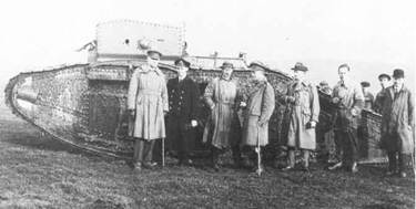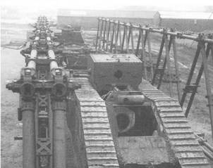 Рис.7 - На испытаниях на полигоне в Доллис-Хилл, Лондон. На заднем плане можно заметить корпус самоходной артиллерийской установки, плавающий экспериментальный танк (возможно, Mark IX) и крановую машину.
