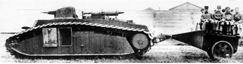 Рис.565 – Интересная иллюстрация к тактическим представлениям французов о применении «боевых» танков. На фото опытный «батальный» танк SRB со специальным прицепом, в котором находилось 800 литров горючего, а также можно было перевозить до 8 человек. В начале 20-х военные теоретики, включая Эстиенна, считали, что «боевыми» танками следует комплектовать некие механизированные пехотные подразделения. В данном случае мы видим, что «боевой» танк сам выступает в качестве средства моторизации пехоты. Только в середине тридцатых французы окончательно сняли требование к «боевым» танкам выступать в качестве транспортера пехоты и снаряжения.