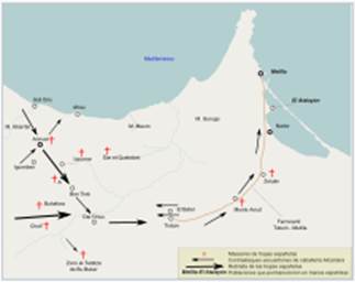 На следующий день, 22 июля 1921г., рифы осадили уже сам город Анвал. Их было около 3000 человек, однако противостоять им испанцы, армия которых находилась в совершенном беспорядке, не могли, и вскоре Анвал был взят, а практически весь его гарнизон, насчитывавший 5000 человек, был уничтожен. Генерал Сильвестре тоже погиб в битве, тело его так и не было найдено. Части испанских войск всё-таки удалось бежать с поля боя, где они были остановлены отрядом под командованием генерала Филиппе Наварро, шедшим на помощь Сильвестре. Объединившиеся войска укрепились на горе Монте-Арруит в 80 км от Анвала, но почти сразу же были окружены рифами и две недели находились в осаде, не имея в достаточном количестве не только пищи, но и воды, вдобавок зная о нестабильности в тылу, где восстали новые племена. В итоге генерал Наварро согласился на капитуляцию, однако рифы, формально согласившись на это, напали на практически безоружных испанцев и устроили массовую резню. Общие потери испанцев под Анвалом и Монте-Арруит составили более 13000 человек, как минимум 600 человек, включая самого Наварро, попали к рифам в плен. Рифы потеряли 800 чел. убитыми. В результате поражения испанцы были отброшены к Мелилье (Рис.618), и создалась реальная угроза её захвата повстанцами, поэтому требовались дополнительные войска из метрополии.