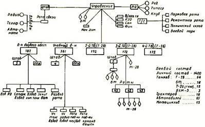 - танковая бригада (2-ой, 3-ий, 4-ый и 5-ый танковые батальоны) – итого по штату 189 средних и крейсерских танков;