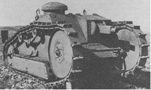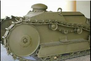 Ходовая часть состояла из 6 опорных катков на борт, соединенных в две тележки и подвешенных на полуэллиптических рессорах к продольной балке. Над ними крепились два поддерживающих ролика. Ведущее колесо находилось сзади и имело зубовое зацепление гусеницы. Направляющее колесо было намного больше по диаметру и выступало за пределы корпуса как у FT-17. (Рис.6)