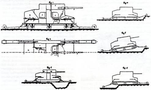 Некоторые, видимо, позднейшие авторы допускают, что Бурштын создал колесно-гусеничный танк! По их мнению, автор, якобы, предполагал использовать рычажно-роликовое приспособление для движения и по дорогам. Выдвижные балки опускались, в таком положении танк опирался на колесики – при этом передние колесики становились поворотными, а задние ведущими. В этом положении машина могла бы развивать скорость по шоссе до 20-30 км/ч. Конечно, колесики на выдвижной балке не могли быть ни управляемыми, ни ведущими. Вероятно, эти авторы не точно интерпретировали пассаж Альбрехта о том, что: «привод должен был быть задним, а передние колёса — управляемыми». В общем, проект Бурштыня до наших дней дает пищу для воображения исследователей и почитателей его изобретения. (Рис.7)