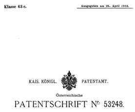 Burstyn решил запатентовать в Австро-Венгрии и в Германии свое изобретение, или, лучше сказать, полезную модель. В Австро-Венгрии ему первоначально отказали в выдаче патенте, сославшись на то, что что гусеничное решение нарушало запатентованное шасси сельскохозяйственного трактора Холта. Тогда Burstyn, видимо, пересмотрел свою заявку и сделал главный упор на выдвигающиеся салазки с колесиками, которые могли опускаться и подниматься, тем самым помогая машине преодолевать препятствия. Заявка Burstyn озаглавлена так: «Устройство для автомобиля для пересечения препятствия… Изобретение касается устройства для автомобиля, которое предназначено для преодоления препятствий на местности, таких как канавы, земляные и железнодорожные насыпи». Такой подход дал свои плоды и 28 февраля 1912 года Бурстын получил германский патент No. Zl. 252 815 (D.R.P.), а 25 апреля — австрийский патент No. 53 248 (Рис.3).