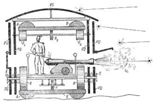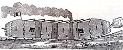 Одной из таких идей был проект французского изобретателя Эдуарда Буйена, который автор окрестил «самым грозным орудием войны», 1874 год. Считается, что Буйен впервые свел воедино в одной конструкции некое подобие гусеницы, паровой двигатель, броню и вооружение. Сам разработчик так описывал свое детище: «Это изобретение экипажей, катящихся по подвижным поворачивающимся рельсам и проходящих по большим дорогам, полям и пустырям. Поставьте бронированную батарею на мою повозку, и вы получите самое грозное оружие войны, какое было когда-либо создано до сих пор». (Рис.1).