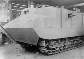 В передней части машины прикреплен деревянный ложный нос, очевидно, размечавший приблизительные габариты будущей боевой машины.