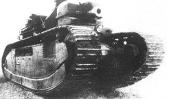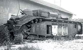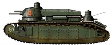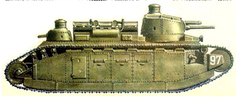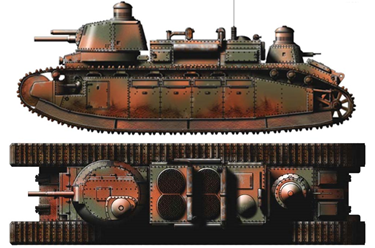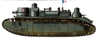 В середине 1920-х годов французские инженеры предприняли несколько попыток усилить боевую эффективность танка. В 1923г., или в 1926г. на одну из машин (№99 “Champagne”) в опытном порядке установили 155-мм короткоствольную гаубицу в литую башню новой формы и французские моторы мощностью по 250 л.с. Масса танка после этого возросла до 74 тонн, что ещё больше снизило максимальную скорость. В итоге модификация 2Сbis (Рис.15) так и осталась в единственном экземпляре, а в 1939 г. его снова перевооружили 75-мм пушкой – по другим сведениям, танк вернули в исходное положение уже в 1926г., а башню с гаубицей отправили в Тунис в качестве огневой точки.