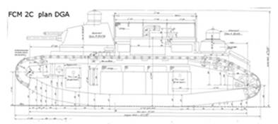 В общих чертах, проект FCM 2С, он же Char Lourd 2C представлял собой утяжеленную и удлиненную версию модели 1А. Максимальная толщина брони увеличивалась до 45 мм, длина – до 10 м. При таком сочетании боевая масса танка ожидалась свыше 50 тонн. В некоторых источниках утверждается, что в качестве силовой установки планировалось использовать два 250-сильных мотора Mercedes GIIIa (есть сведения, что стандартная мощность Mercedes GIIIa составляла 180 л.с.). Электрическая трансмиссия и силовая установка суммарной мощностью 500 л.с. должны были улучшить ходовые качества танка, например, считалось, танка сможет двигаться со скоростью 8-10 км/ч. Основным орудием рассматривалась 75-мм пушка в башне. Вновь встал вопрос о целесообразности второй – пулеметной – башни на корме танка. Экипаж 10 человек.