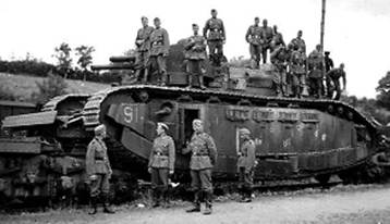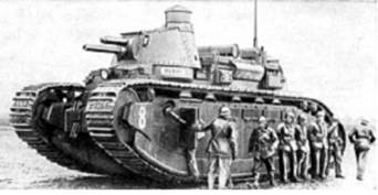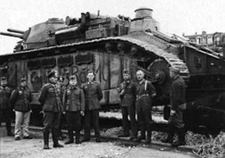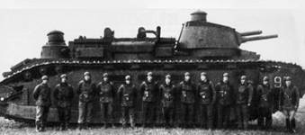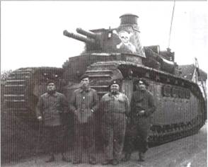 Рис.17 - Члены экипажа тяжелого танка 2С № 90 «Пуату» на фоне своей машины, Брийе, зима 1939/40 года. Обращает на себя внимание изображение «мертвой головы» на башне танка.