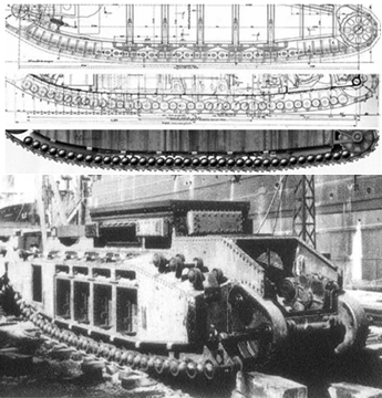 Согласно техническому заданию, танк должен был преодолевать траншеи и рвы шириной 4 метра и вместе с тем не вылезать за габариты железнодорожных платформ. В результате при длине танка чуть больше 10 метров соотношение ширины к высоте получилось 1:2. С целью увеличения преодоления препятствий ходовую часть сделали по аналогии с британской: она получилась многоколесной с гусеницами, полностью обхватывающими корпус, что привело к увеличению высоты ходовой части. (Рис.6).