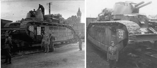 Двигатели Maybach были получены ещё в 1919г. в качестве репараций от Германии и до этого момента оставались невостребованными. В конце 1939 – начале 1940 года часть танков батальона получила дополнительную броневую защиту. Например, на 2С № 97 «Нормандия» (танк командира 51-го танкового батальона) толщину лобовой брони довели до 90 мм, бортов – до 50 – 65 мм, появился броневой кожух и над центральной частью корпуса. В результате, масса машины составила 75 т. (Рис.20)