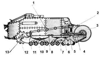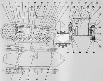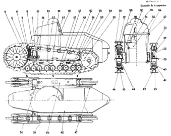 Разрабатывавшаяся машина радикально отличалась от всего, что создавалось в тот период. Проектом предусматривалось, что масса машины составит 6 т, вооружение – один пулемет, экипаж 2 человека, максимальная скорость - 9,6 км/ч. Ходовая часть оснащалась полужесткой подвеской – с одним амортизирующим элементом в передней части. (Рис.4)