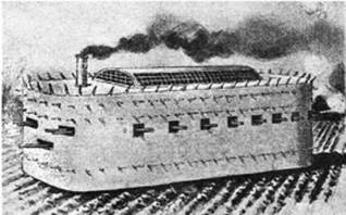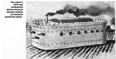 Но, несмотря на весь скептицизм, военное руководство, в том числе и под давлением фронтовых офицеров, собственными глазами видевшими, сколько разрушений может причинить всего лишь один английский танк, прорвавшийся к окопам, обязано было принять меры для создания немецкого варианта нового средства войны типа «танк». Предваряя практические шаги, в печати появился рисунок устрашающей «машины кайзера для прорыва неприятельских рядов» «размером с пассажирский вагон», с шипами на броне и 20-25 пушками и пулеметами (Рис.1).