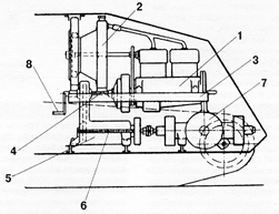1 — двигатель, 2 — радиатор, 3 — подмоторная рама, 4 — вал главного сцепления, 5 — коробка передач, 6 — приводной вал, 7 — картер бортового редуктора, 8 — пусковая рукоятка.