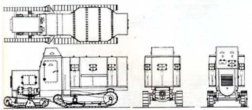 Машина имела массу 18-20 т при габаритах: длина – 7 м, ширина – 2,5 м, высота – 3,3 м. Ходовая – четыре гусеничные секции с подвеской на листовых рессорах.