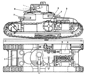 1 — посадочные люки, 2 — ведущее колесо, 3 — двигатель, 4 — коробка передач, 5 — тормоз, 6 — 57-мм пушка, 7 — пулемёты MG.08.