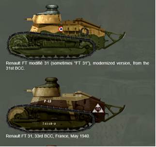 На нижнем снимке модернизированный танк FT-31 (Renault FT-31) – хорошо видны новые направляющие колеса. Машина из состава 66-го отдельного танкового батальона (BCC — Bataillons de Chars de Combat), который нес службу в французской колонии в Марокко. Регистрационный номер – 66187. Неизвестно каким образом, танк из состава подразделения, дислоцировавшегося в Марокко, оказался во Франции. Возможно, что танк был отправлен во Францию для модернизации.