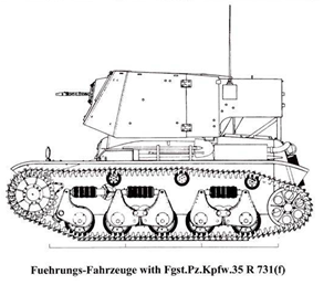 Параллельно, для обеспечения САУ 4.7 cm Pak(t) (Sfl) auf Fgst.Pz.Kpfw.35 R 731(f), выпускались командирские бронемашины Befehlspanzer fuer 4,7cm PaK(t) Einheiten auf Panzerkampfwagen 35R(f) или Führungs-Fahrzeuge auf Fgst.Pz.Kpfw.35 R 731(f), оснащенные дополнительным радиооборудованием. Вместо пушки у них устанавливался один 7,92-мм пулемет. Всего было построено 26 таких машин. (Рис.35)