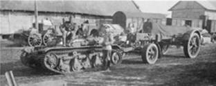 Помимо САУ шасси R-35 использовалось немцами и для других машин. К февралю 1941г. 110 тягачей на базе R-35 - Umbau von Panzerkampfwagen 35R (f), или Munitionspanzer 35R (f), или Munitionsschlepper 35R(f) - были приданы батареям, оснащенным 149-мм гаубицами sFH 18 и более мощными 17 cm K18/21 cm Mrs 18. Для превращения танка R-35 в тягач было достаточно снять башню, выгрузить боекомплект, отверстие закрыть брезентом. (Рис.38)