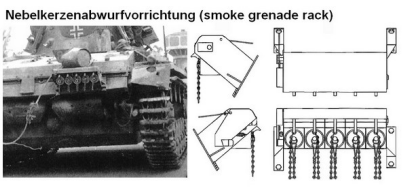 С августа 1938 года немецкие танки оснащались Nebelkerzenabwurfvorrichtung (система установки дымовых гранат). Это устройство размещалось на корме корпуса. Стойка содержала пять гранат, которые командир мог активировать по проводам. При активации, Panzer пятясь кормой, мог скрыться в дымовой завесе. Эта система оказалась не очень эффективна и позже во время войны заменялась установленными на башне дымовыми гранатометами. (Рис.5)
