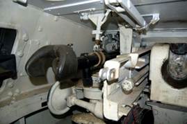 Поворот башни осуществлялся за счёт электрического привода, располагался с левой стороны башни. Поворотом башни управлял наводчик. Вращать башню можно было и вручную – для этих целей использовался специальный штурвальчик справа от механизма вертикального наведения пушки. Существовал и второй механизм поворота башни, которым управлял заряжающий. (Рис.4)