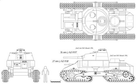 Габариты: длина 11 650 мм, ширина 3 600 мм, высота 4 500 мм. Диаметр погона башни 2 700 мм. Бронирование: лоб корпуса, лоб башни 50 мм, прочие вертикальные элементы корпуса и башни – 40 мм. Вооружение: 105-мм орудие Cannone da 105/28 M.13 в главной башне и три 65-мм орудия Cannone da 65/17 M.13 (каждое в отдельной башне), а также четыре пулемёта Fiat-Revelli 1914 калибра 6,5-мм. Основное 105-мм орудие имело углы вертикальной наводки -5°...+20°, а горизонтальной плоскости могло поворачиваться на 300° - в заднем секторе находилась кормовая башня, мешавшая полному повороту главной башни и главному орудию. Боекомплект к 105-мм орудию 55 снарядов. Экипаж 10 человек: командир, 5 заряжающих, 3 наводчика, водитель. В качестве силовой установки должен был использоваться V-образный, 12-цилиндровый авиационный двигатель Fiat A.25 жидкостного охлаждения. Нормальная мощность двигателя 950 л.с., максимальная 1 000 л.с. Двигатель должен был разгонять танк до максимальной скорости в 30 км/ч. Предусматривался вспомогательный двигатель для привода динамо, дающий ток для освещения, радио и т.п. – им являлся авиационный V-образный, 4-цилиндровый мотор Fiat A.60 жидкостного охлаждения, который развивал мощность 135-145 л.с. при 2 200 об./мин. (Рис.6)
