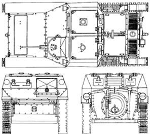 Приводится, что масса танка в подобной конфигурации составляла 2,9 тонн или 2,7 тонн. Габариты: длина 3030 мм, ширина 1400 мм, высота 1200 мм. Бронирование 5-10 мм. Максимальная скорость 40 км/ч. Запас хода 125 км.