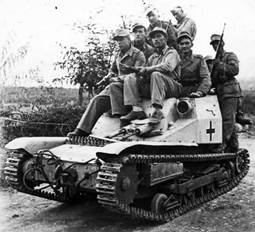 Следующий конфликт, в котором довелось принять участие итальянским минилегким танкам C.V.3 оказалась Гражданская война в Испании. Всего за 1936-1938гг. в состав Итальянского экспедиционного (добровольческого) корпуса (Corpo Truppe Volontarie, CTV) было передано 144, 149, 155 (или 160) танков-танкеток. В ходе кампании итальянцы осознали слабость пулеметных машин, поэтому зачастую к группе пулеметных C.V.3 назначался огнеметный вариант, который являлся главной ударной силой группы, а пулеметные машины его поддерживали. Соотношение в группе пулеметных машин к огнеметным составляло из расчета 2:1. (Рис.31)