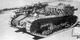По горизонтали орудие можно было наводить без доворота машины влево и вправо по 15 градусов, угол возвышения - от -18° до +30°. Предполагалось иметь боезапас в 53 унитарных патрона к орудию, которые хранились в металлическом ящике, расположенном в задней части отделения водителя. В ходовой части читается интересное изменение – вместо пластинчатых рессор в качестве элементов подвески установлены пружинные рессоры, а гусеницы были изготовлены из одинарных и коротких звеньев, всего 72 звена из прессованной стали. (Рис.56)