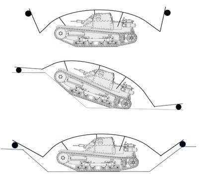 Кривизна каркаса, прикрепленного к корпусу машины, обеспечивала достаточную жесткость и прочность для моста или пандуса через препятствие, чтобы выдерживать вес проезжающих танков типа CV3 или грузовиков. Спереди и сзади конструкции находились складные пандусы на колесиках, которые можно было поднимать или опускать, обеспечивая короткий пролет, необходимый для закрытия зазоров между секцией моста и землей. Пишут, что рампа опускалась экипажем изнутри машины посредством троса. Когда рампа/мост находилась в рабочем положении, через нее проходила техника, экипаж мог выйти из машины. (Рис.67)