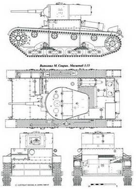 Современники указывали массу танка Т-26 обр.1937г. со всеми наворотами в 9,5 тонн, в более поздних источниках приводят 9,75 тонн. Бронирование танка при этом практически не изменилось. (Рис.12, Рис.13)