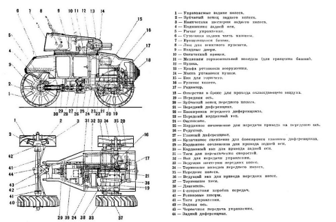 Для колёсного танка был выбран бензиновый 4-цилиндровый двигатель FIAT мощностью 110 л.с. (по другим данным, его мощность составляла 75 л.с.) и жидкостной системой охлаждения. Мотор устанавливался справа в передней части корпуса, а слева от него находился радиатор, который всасывал охлаждающие воздух через бронированные жалюзи оригинальной формы в лобовом листе моторного отсека. Через сцепление мотор приводил в действие четырехступенчатую коробку скоростей (3 скорости вперед и 1 назад), расположенную ниже мотора, и через дифференциал, который при вращении одного из колес без сопротивления мог быть заблокирован кулачковой муфтой передавал усилия на пару колес, работавших нормально. Отсюда вращение передавалось в одну сторону через карданные сочленения на передний продольный вал, в другую – на задний вал, соединенные каждый со своим дифференциалом, от которых и вращаются каждое в отдельности все четыре колеса. Передним колесам (которые могли качаться на листовых рессорах и спиральных пружинах около оси ведущих шестерен) вращение передавалось ведущими шестернями, вращавшими зубчатые венцы, назад же вращение передавалось через конический промежуточный зубчатый привод на две конические шестерни, вращавшие большой зубчатый венец на заднем колесе. Промежуточный привод также допускал качание колес около задней оси посредством рулевых тяг, захватываемых коленчатым рычагом управления, который сидел на оси червячной передачи управления. Таким образом, если расположенным впереди рулевым колесом повернуть ее ось, тем самым посредством промежуточного зубчатого привода поворачивался ведущий назад вал для передачи управления, а вместе с ним – приводный червяк, приводивший в движение червячное колесо и рычаг управления. Тормоза с внутренними колодками имелись только на передних колесах, но кроме того имелся тормоз и на коробку скоростей.