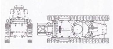 Ходовая часть сохранила 8 опорных катков на борт, сблокированных в четыре тележки, количество поддерживающих роликов уменьшилось до 5 и ведущее колесо было большего диаметра. Доработке подверглась балка, на которой крепилась система натяжения гусениц (спиральная пружина) и направляющее колесо. Подвеска осталась балансирная, с листовыми полуэллиптическими рессорами, прикрытыми броневыми листами. Гусеница включала 52 трака и в целом не сильно отличилась от гусеницы FT-17. Правда, на более поздних модификациях, гусеничные траки выполнялись не гладкими, что обеспечивало лучшее сцепление с поверхностью. (Рис.9)
