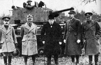На фоне брони танка Cruiser Tank MK.II CS весь цвет антигитлеровской коалиции: в центре премьер-министр Великобритании У. Черчилль, слева от него премьер-министр польского правительства в изгнании и главнокомандующий польских вооруженных сил Владислав Сикорский, справа – главнокомандующий Свободной Франции, генерал Шарль де Голь. Крайний слева (рядом с Сикорским), вероятно, генерал Giffard Martel, в 1940-1942гг. командующий Королевским бронетанковым корпусом.