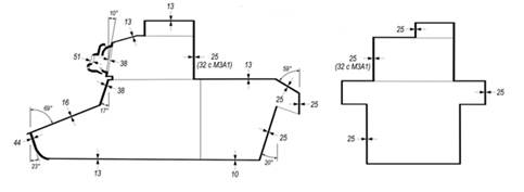 В кормовой части появился небольшой «хвостик», благодаря которому удалось улучшить защиту системы охлаждения – в «хвостике» находились глушители и через него выводили горячий воздух. На надмоторной плите, уязвимой для гранат и бутылок с зажигательной смесью, вместо решётки имелся хорошо защищённый воздуховод, в котором скрывались глушители выхлопной системы. Снаружи остались только воздушные фильтры. Толщина бронирования крыши корпуса и днища – 10 мм. (Рис.4)